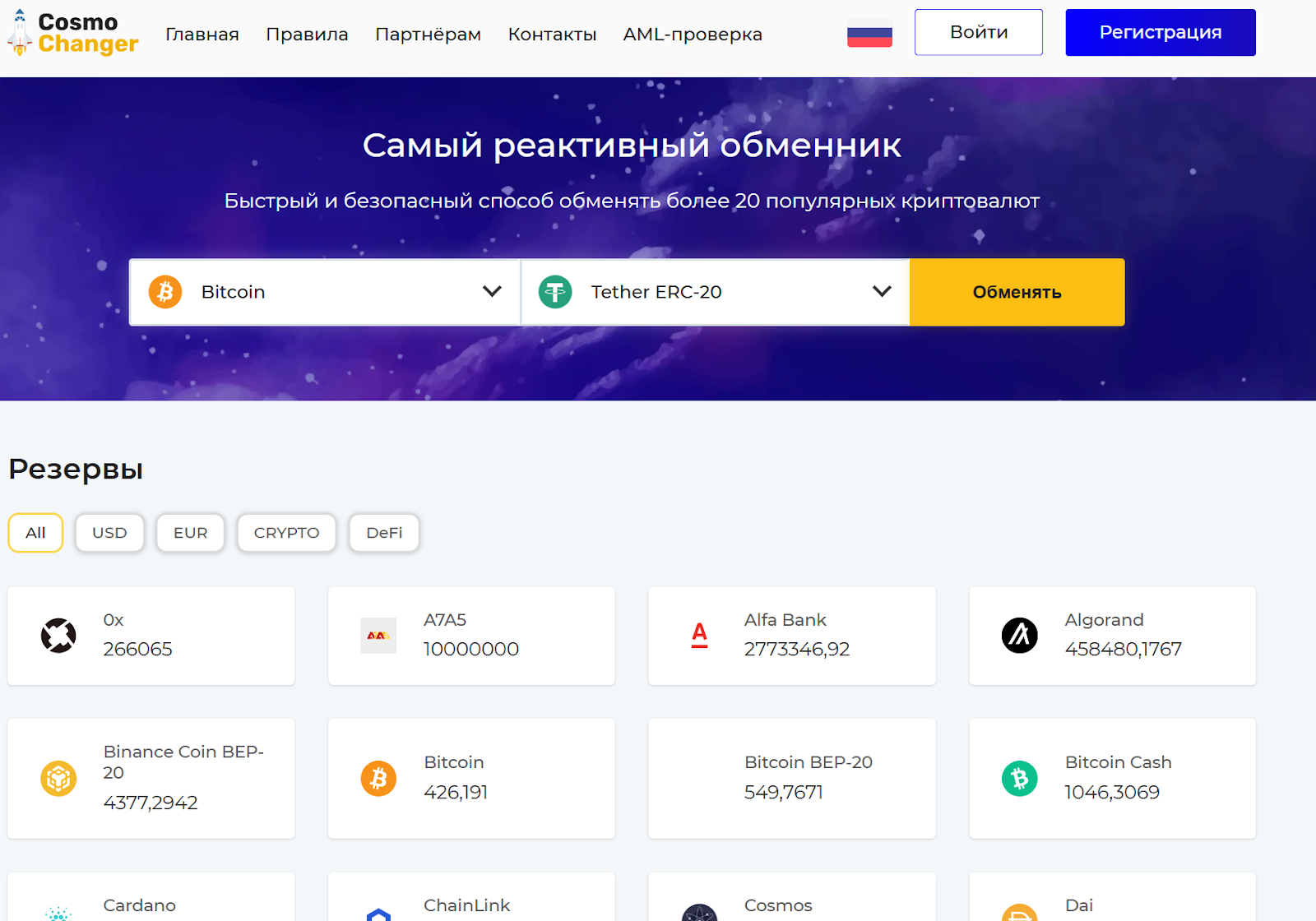 Cosmochanger предлагает услуги по обмену более чем 20 популярных криптовалют. Например, Bitcoin, Ethereum, Tether в различных сетях. Имеется возможность конвертации как в другие криптоактивы, так и в фиатные валюты через российские банки или платежные системы. Плюс предоставляются наличные сделки в городах России в рублях, долларах или сомах. Процесс якобы занимает не больше 10-15 минут от создания заявки до зачисления.