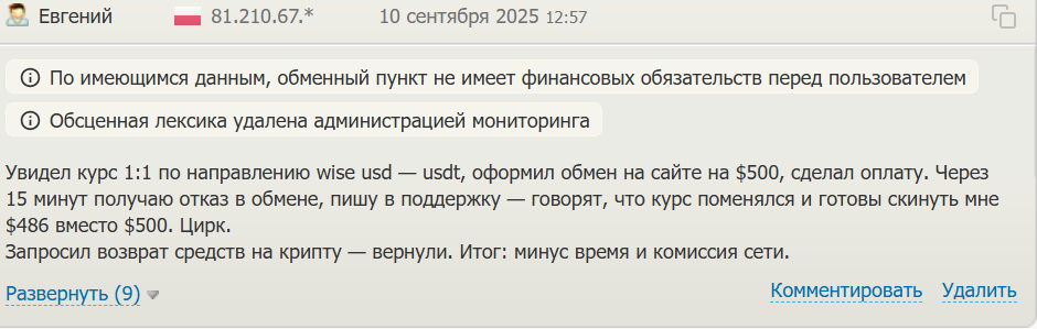 Жертвы делятся историями о замороженных транзакциях, когда после оплаты в течение 10 минут заявка якобы проваливается из-за риска по BitOK. Возврат происходит через 24 часа с 2-5% штрафом. Авторы собирают жалобы на невыгодные курсы, которые меняются при задержках в сети, и на поддержку, которая отвечает шаблонно или вовсе молчит.
