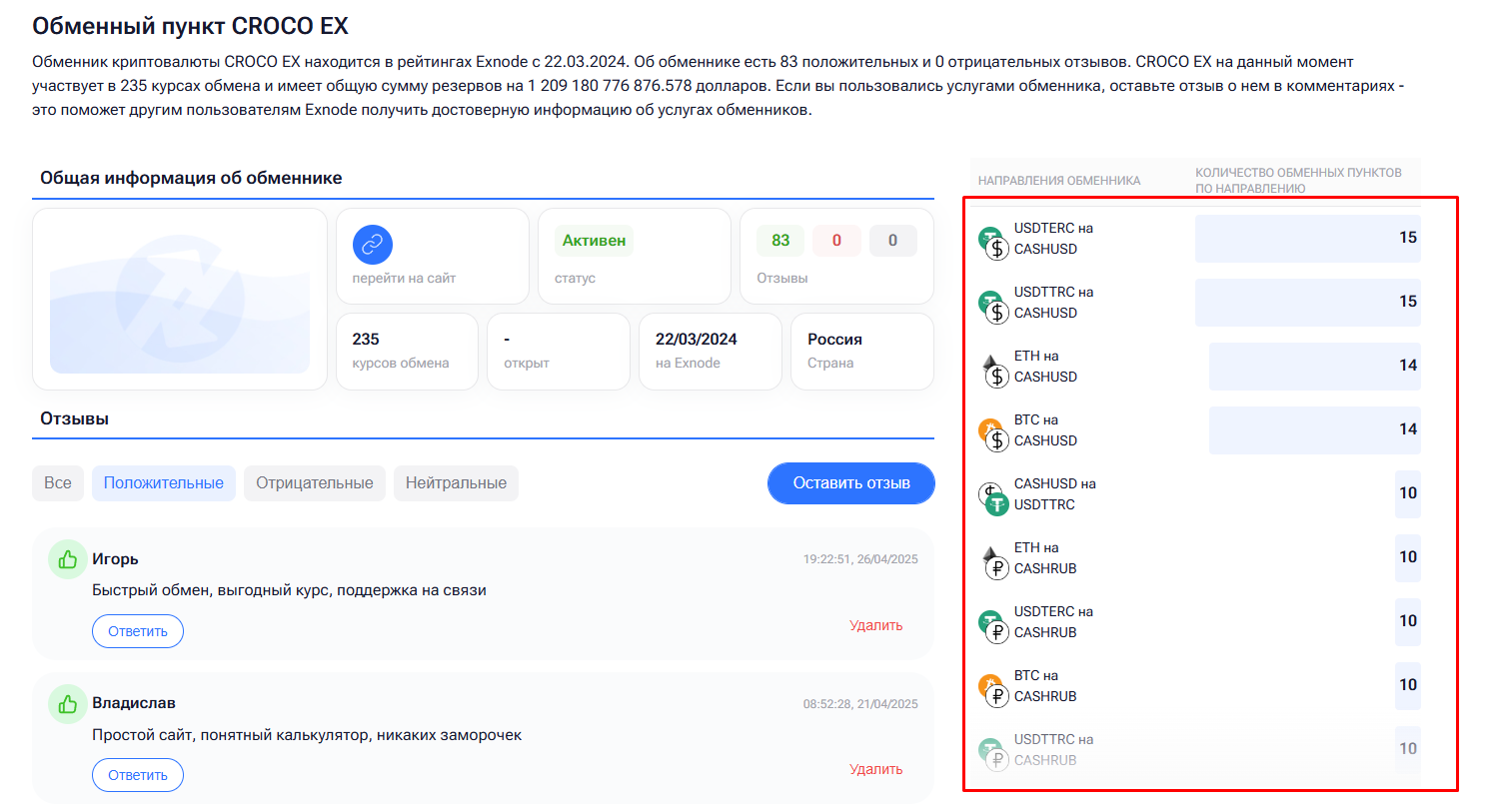 Как правило, на сайте ExNode и сторонних платформах, отзывы обменник Croco Ex Ru собирает положительные. Клиенты отмечают быструю обработку заявок, фиксированный курс и мгновенный обмен, однако команда Croco Exchange не позволяет продавать / покупать криптовалюту онлайн, из-за чего отзывы можно считать накрученными.