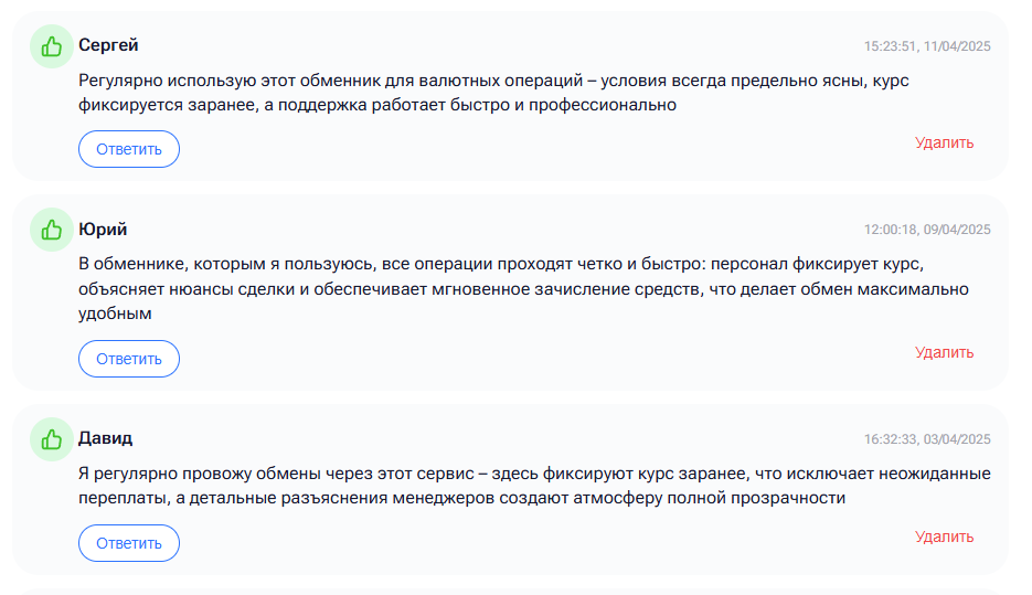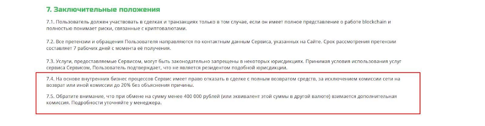 Если ваши активы имеют высокий риск AML, команда может взять комиссию до 20% и только после этого вернуть средства. По этой причине важно заранее проверять криптовалюту через AML Bot / Crystal Blockchain. При этом на сайте не указаны минимальные и максимальные суммы сделок, но известно, что при обмене менее 400 тысяч рублей могут взиматься дополнительные сборы, о которых нужно уточнять у менеджера.