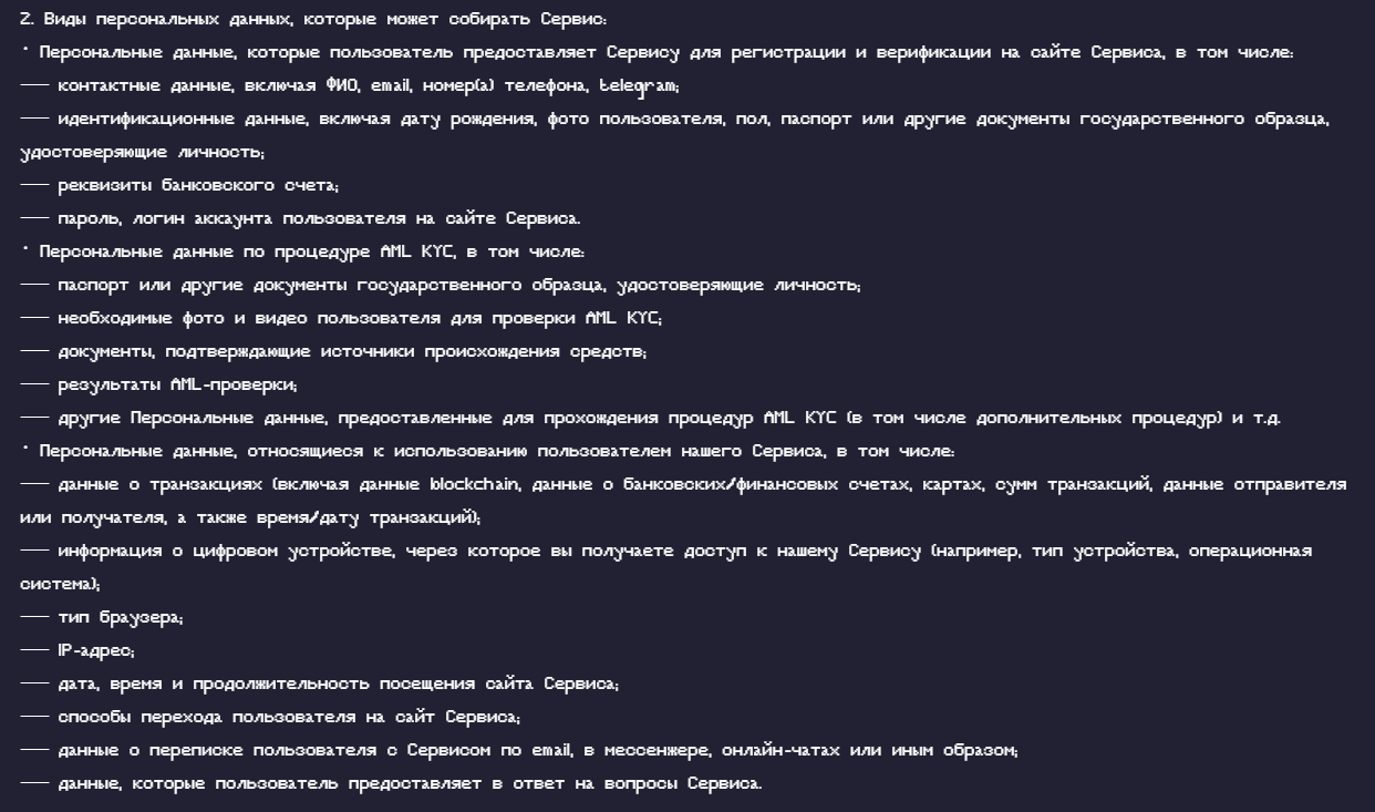 Сервис в правилах сообщает о сборе и передачи персональных данных клиентов.