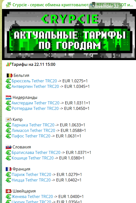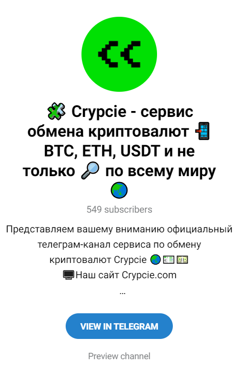 На своем телеграмм-канале crypcie com периодически выкладывает тарифные планы на обмены валют, призывая сверяться с их Телеграмм для уточнения.