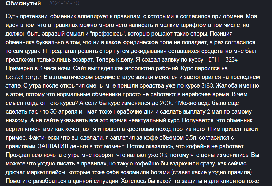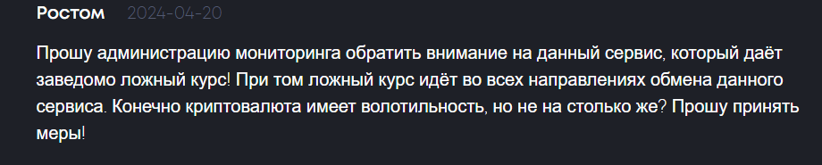 - Поступают жалобы на отсутствие фиксированного курса при обмене и при попытке обменять криптовалюту на одну сумму, можно получить совершенно другую, по более позднему и невыгодному курсу, следовательно, есть риск потерять из-за разницы большое количество средств при использовании данной платформы.