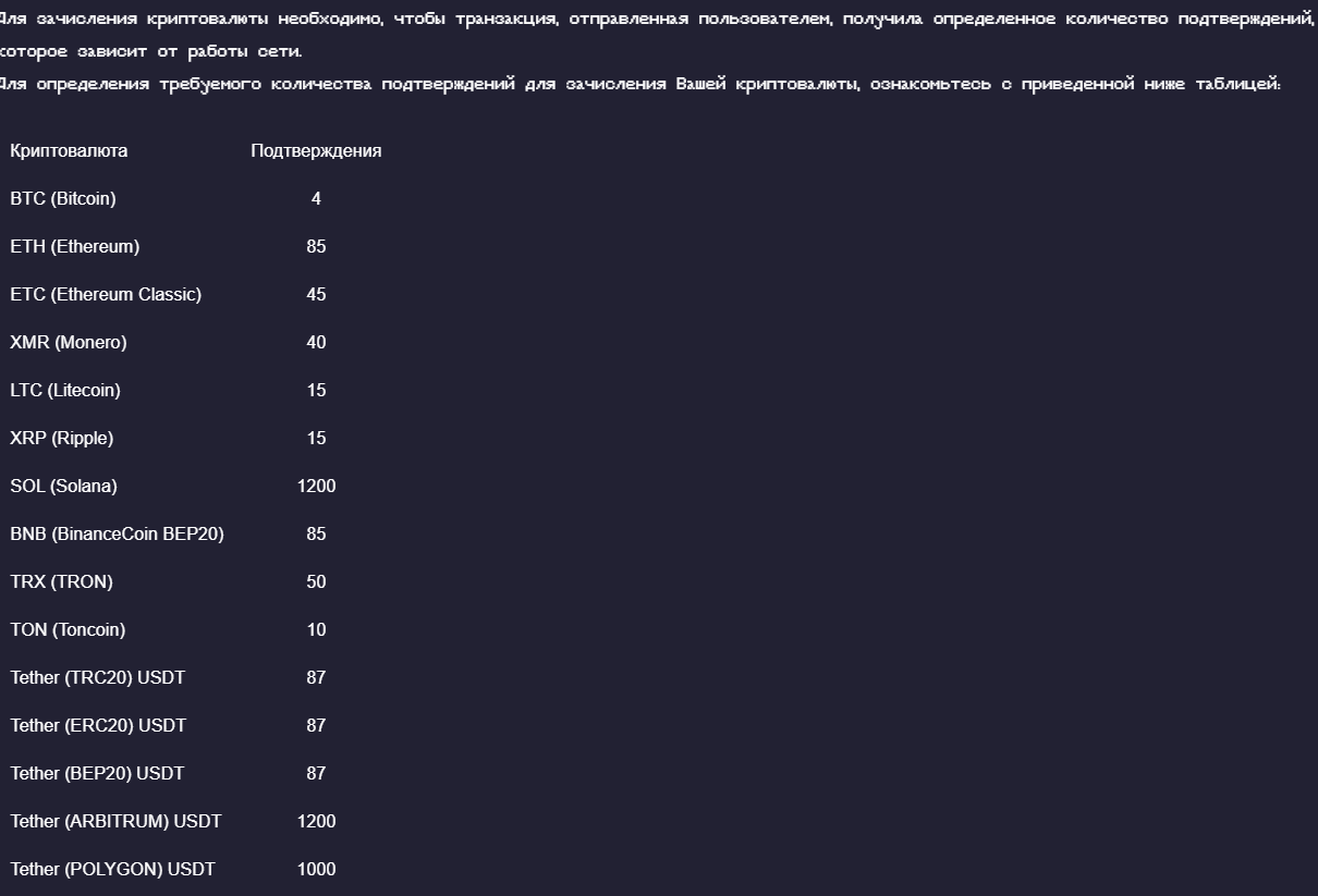 Crypcie exchange для зачисления криптовалютной транзакции требует определенного числа подтверждений, от 4 до 1200 в зависимости от валюты.