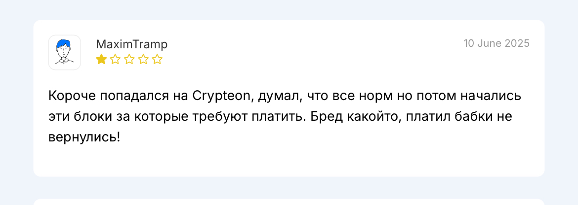 - Негативные отзывы о Crypteon. Пользователи пишут о случаях обмана, что снижает авторитет компании и отталкивает новых юзеров от сотрудничества.