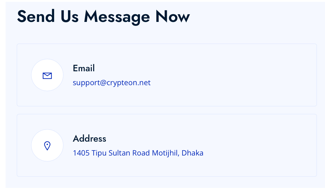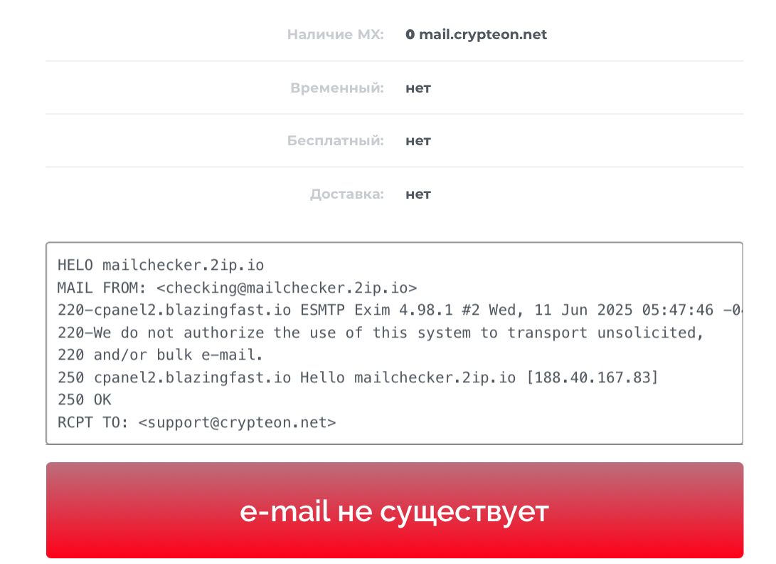 Для связи с саппортом предусмотрен только один канал связи — электронная почта. Адрес — Support Crypteon net. 2IP показал, что такого адреса на самом деле нет. Это значит, что коммуникация между площадкой и юзерами отсутствует. Это создает неудобства для последних в случае проблем. Не получится решить вопрос в доступном порядке.