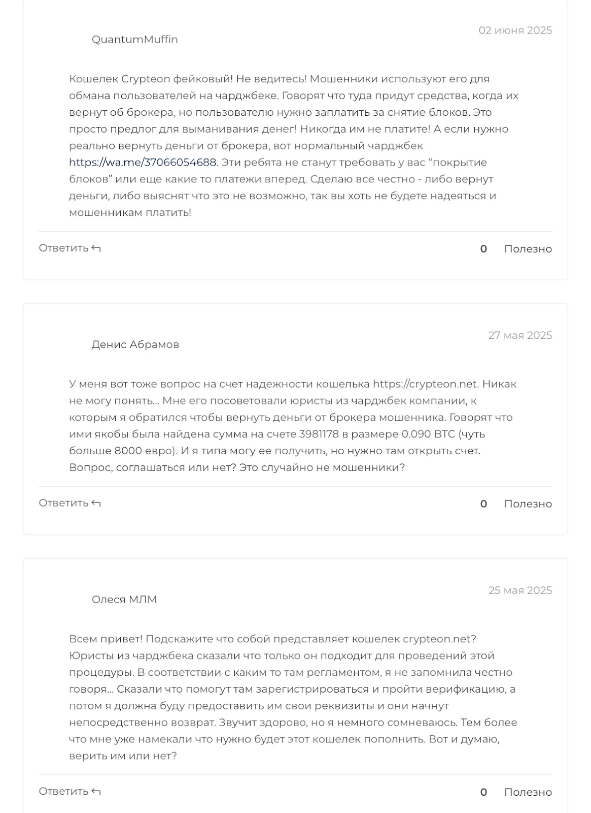 Репутация у кошелька сомнительная. В сети пишут, что компания работает в связке с юристами. Они связываются с пользователями по поводу возврата средств и предлагают открыть счет в «Криптеон». Якобы он поможет быстрее разблокировать деньги. В то же другой юзер пишет, что система блокирует участников и предлагает оплатить взносы для получения доступа к аккаунту. Однако, после этого ничего не происходит.
