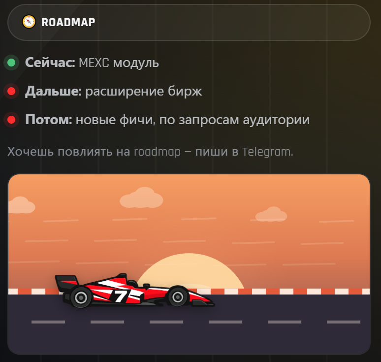 Исходя из дорожной карты, в следующем году в нее планируют добавить поддержку других бирж, а также новые фичи, за которые проголосуют участники сообщества Crypterm.