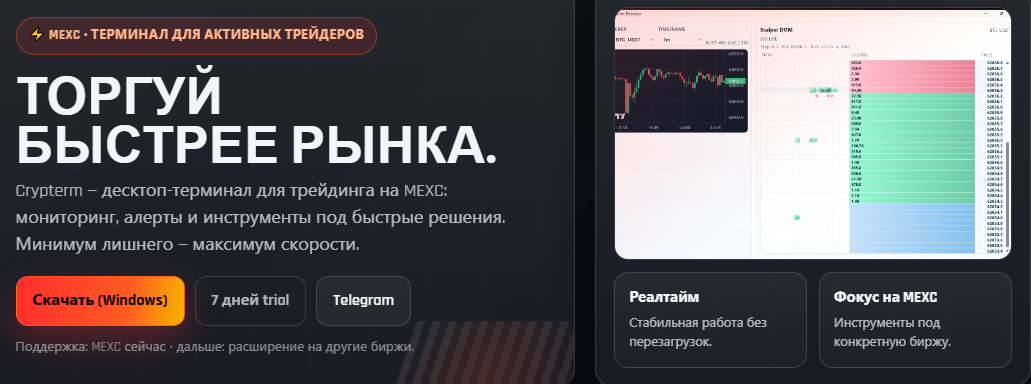 Crypterm — продвинутый торговый терминал для заключения сделок с криптовалютами. Платформа доступна только клиентам биржи MEXC и дает им следующие преимущества: мониторинг токенов, уведомления, скальпинг-инструменты и другие.