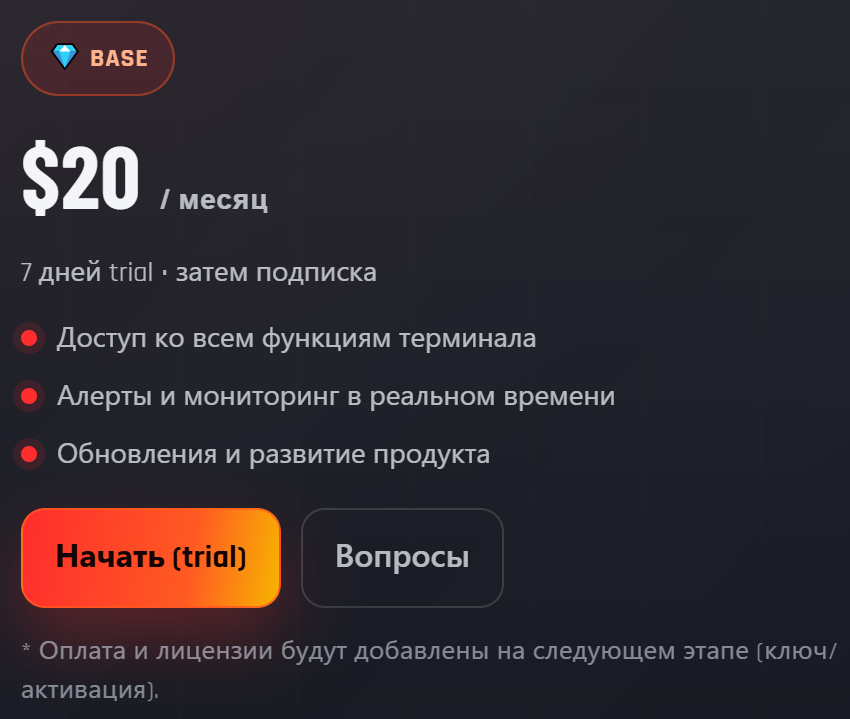 На момент написания материала представители «Криптерм» предлагают только один вариант подписки — Base с оплатой в 20 долларов за месяц. Приобрести доступ можно с зарубежной банковской карты или в криптовалюте.