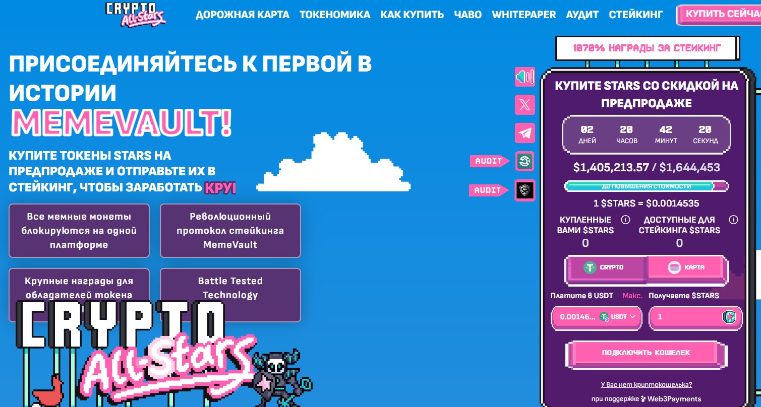 Проект Crypto All Stars, судя по дате создания его сообществ в социальных сетях, начали развивать в августе 2024-го. Утверждают, что разработали некую революционную систему смарт-контрактов MemeVault, которая якобы позволит размещать все популярные мемкоины на одно платформе. Не объясняют, какая польза от этого будет подписчикам.