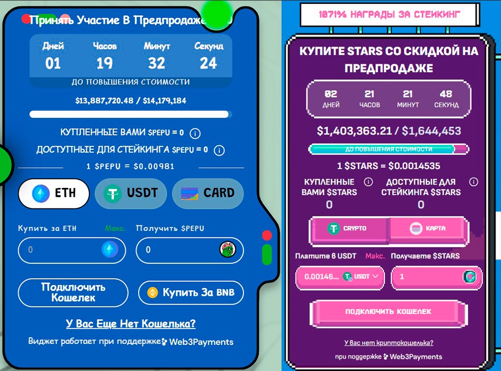 Сайт All Stars сильно напоминает сайт мемкоина Pepe Unchained: у них одинаковая форма покупки токенов, ведутся сообщества в одних и тех же социальных сетях. Оба проекта предлагают покупать свои токены через подозрительный криптокошелек Best Wallet, о котором отсутствует какая-либо информация. Контент в соцсетях примерно одинаковый и одни и те же аудиторы: Coinsult и SolidProof.