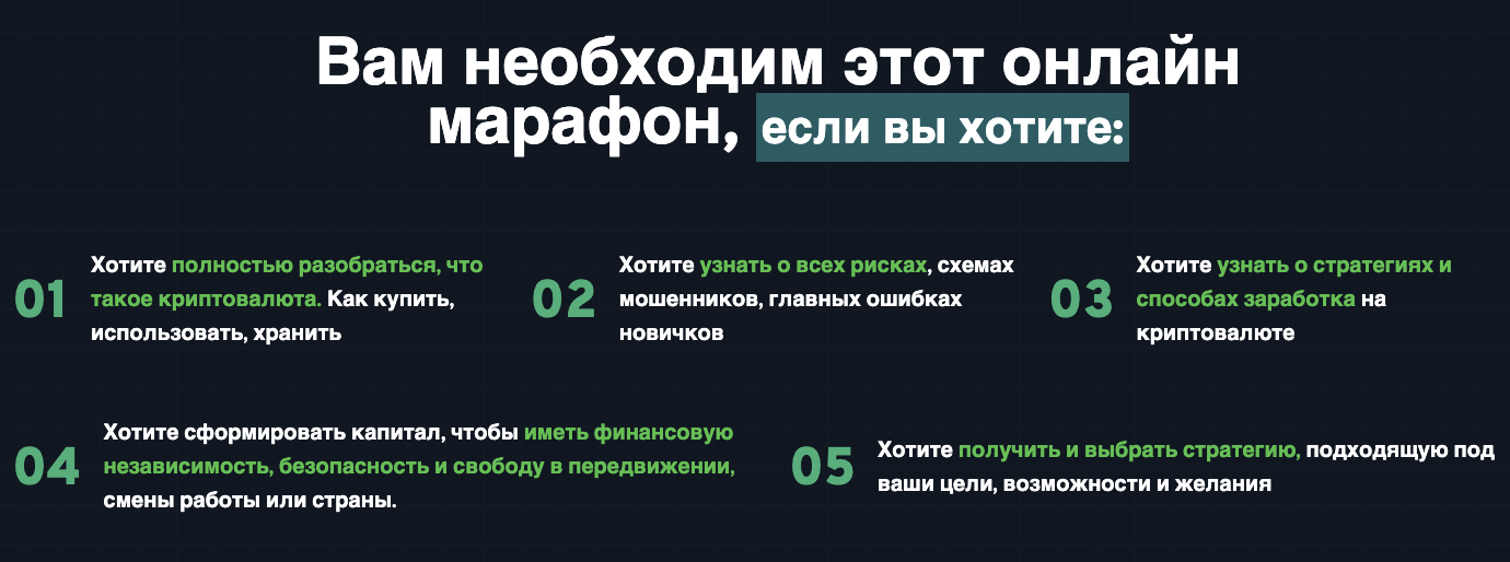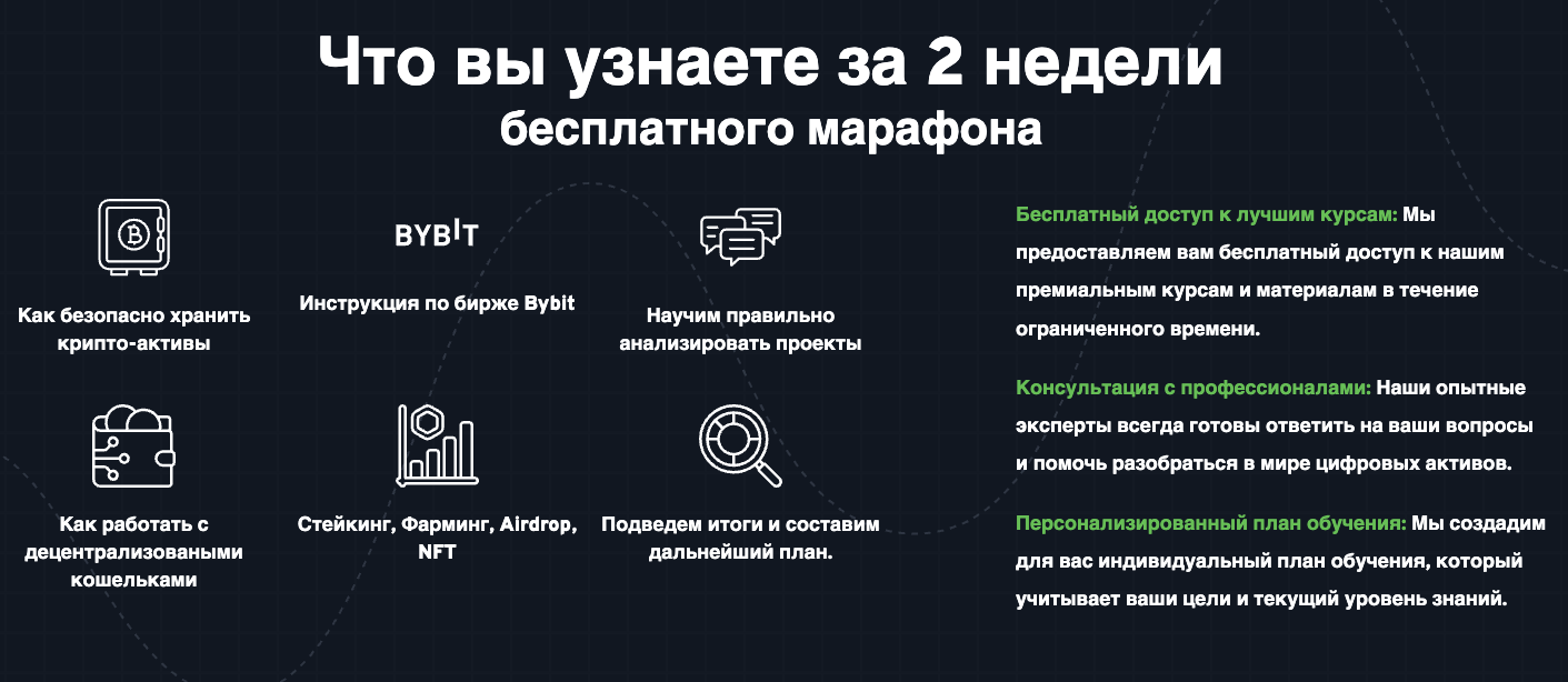 На ресурсе есть блок, в котором описано, что сможет узнать новичков в криптовалютах на марафоне. Судя по по содержащейся в нем информации, ничего эксклюзивного и реально полезного в нем нет.