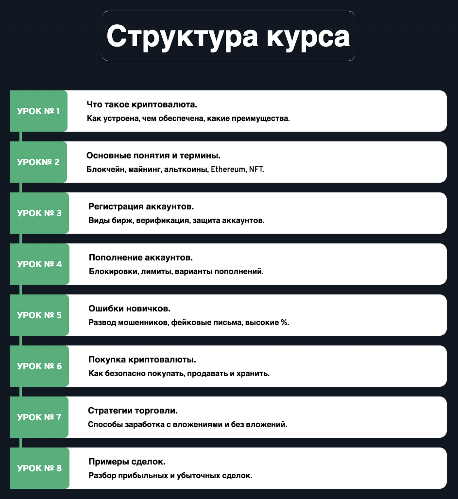 Организаторы курса обещают научить базовым навыкам обращения с децентрализованными активами. Мы заметим, что вся содержащаяся в обучающей программе информация есть в публичном доступе. При желании ее любой сможет собрать самостоятельно за один месяц.