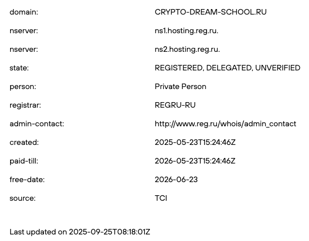 Так как сведений об организаторах курса нет, мы проверили то, как долго существует сайт школы. Для этого запросили данные домена crypto dream school ru из WHOIS.