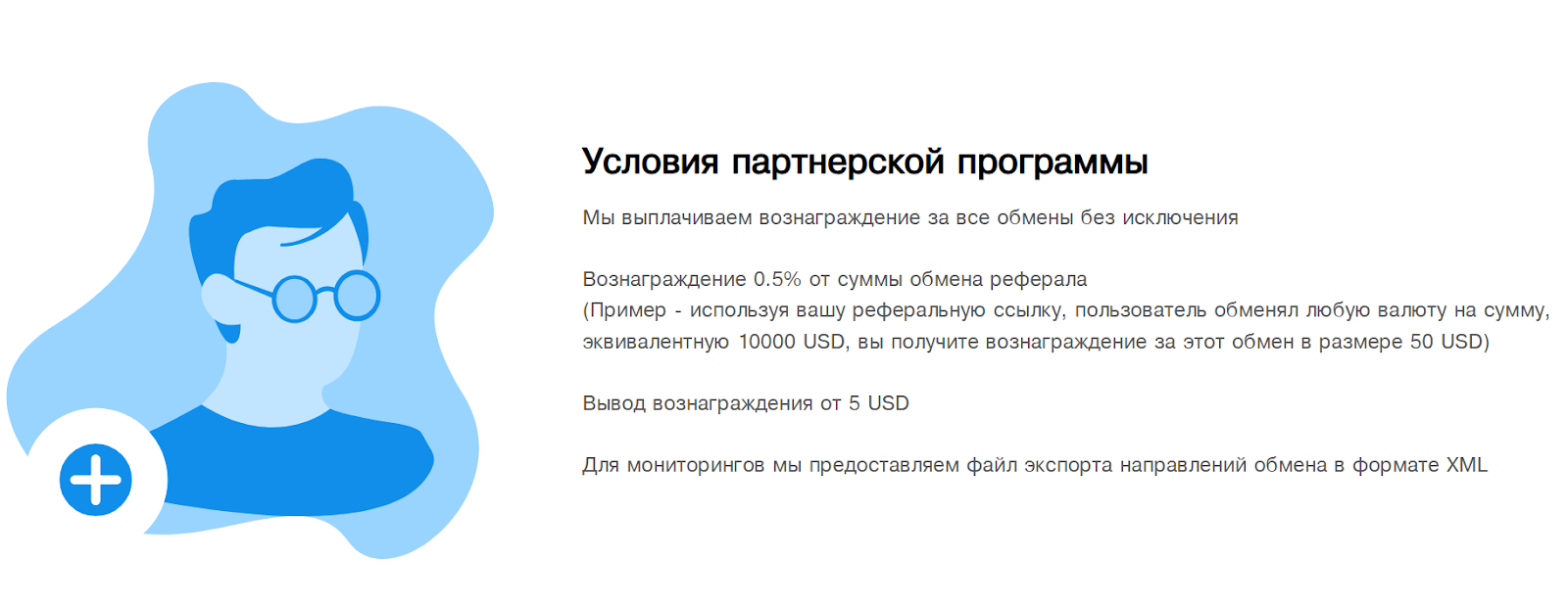 Пользователи могут участвовать в реферальной программе и получать вознаграждение в размере 0,5% от суммы обмена реферала. Минимальный вывод дохода – 5 долларов.