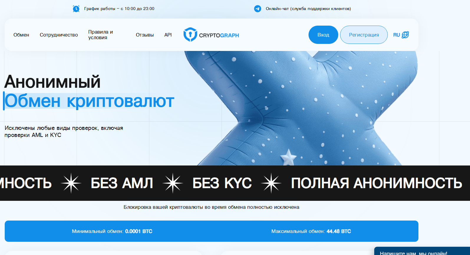 CryptoGraph – анонимный обменник криптовалют. Проводит обмен без AML. Зарегистрирован в Нидерландах, но юридических документов нет. Подробнее – в нашем обзоре.