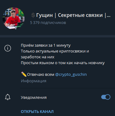 Crypto Guschin — Telegram-канал про криптовалютный арбитраж. Автор заявляет, что знает, как зарабатывать от 2 до 8% за круг и может научить этому каждого. Нужно разбираться, насколько эти заявления соответствуют действительно и нет ли тут обмана.