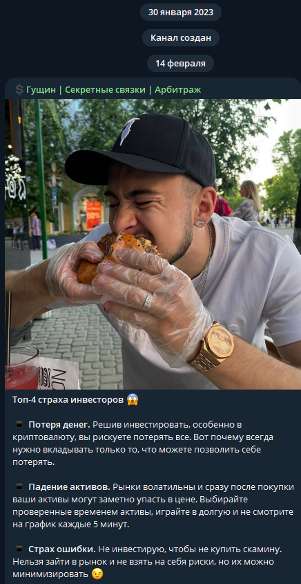 Среднее количество просмотров — 1.5 тысячи. При 50 реакциях это выглядит очень странно. Есть высокая вероятность, что аудитория накручена.Сейчас Марат Гущин рассказывает о криптовалютных связках. Раньше работал через аккаунт GushinCrypto, но теперь crypto_guschin. Предлагает обучение и заработок по отработанным арбитражным связкам: переводить деньги между криптоплощадками.