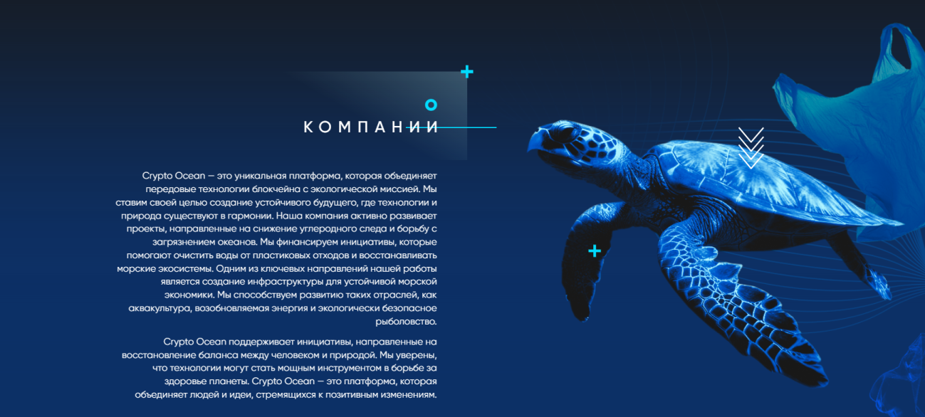 Компания работает через сайт crypto ocean com. Он настраивается на английский или русский язык. По словам создателей, проект объединяет технологии вместе с экологией. Цель компании — помочь вложениям в площадку способствовать развитию проектов, которые занимаются восстановлением природных ресурсов. Крипто Океан специализируется на 3 направлениях. Среди них: создание инвест. продуктов, продвижение блокчейна и укрепление комьюнити единомышленников.