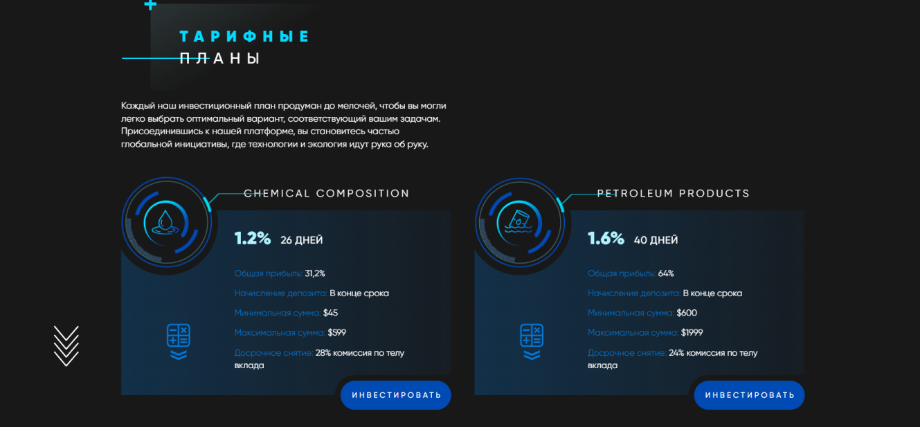 Пользователям предложены такие варианты вложений:- Chemical Composition. Минимальное вложение 45 долларов, а максимальное 599 долларов. Обещают 1.2% дохода в сутки и и 31.6% за 26 дней. Комиссия по телу депозита 28%;