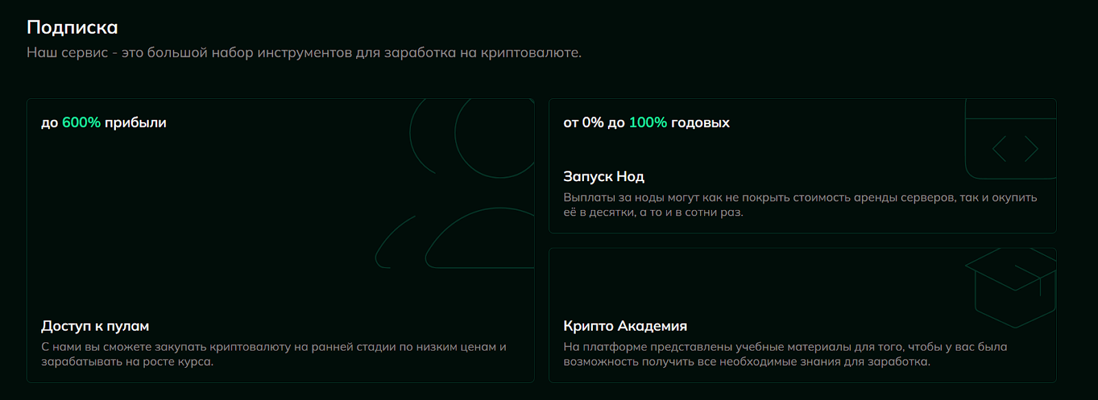 Дальше вам предлагают ознакомиться с основными инструментами и условиями сотрудничества. Это показатели возможной прибыли: до 600% на пулах, до 100% годовых на нодах, а также Крипто Академия. При этом неизвестно, на каких основаниях они предлагают такие значения.