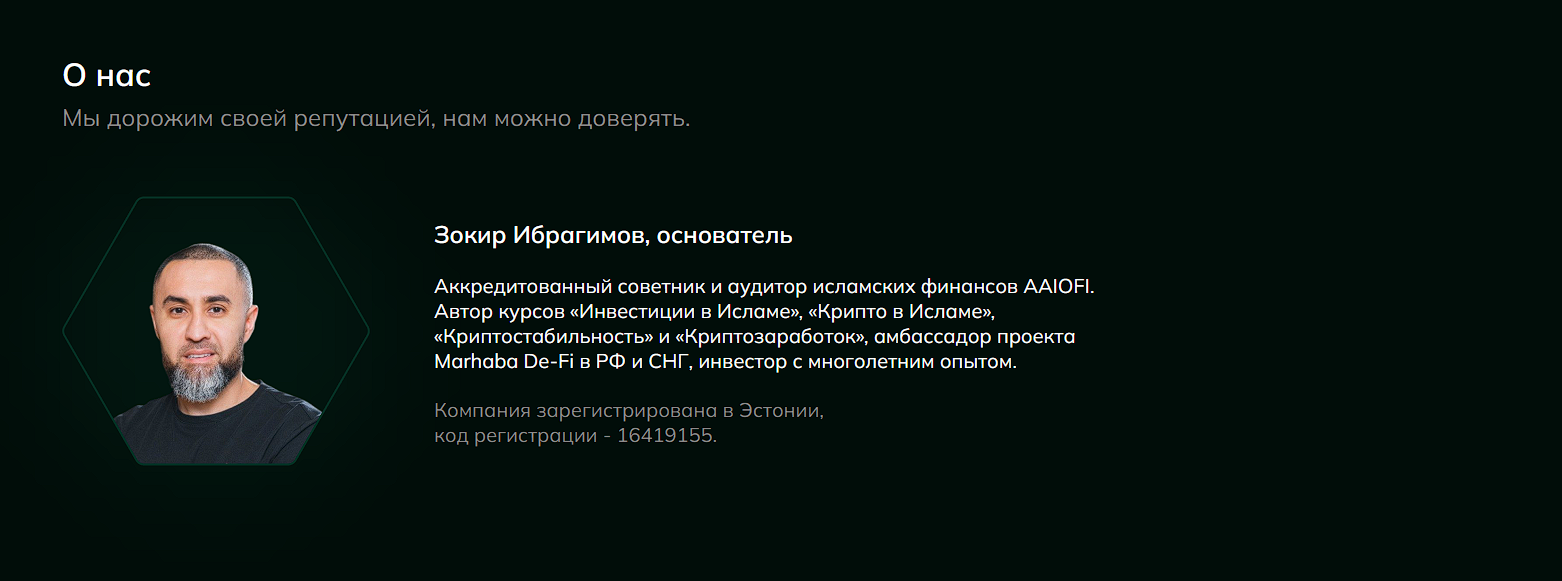 Компания зарегистрирована в Эстонии и имеют рег. номер 16419155, они пытаются увеличить прозрачность проекта за счет наличия опыта у основателя в создании различных курсов, амбассадорства проектов Marhaba De-Fi в РФ и СНГ. Однако, криптосиндикат не имеет лицензии