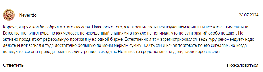 • Скам: пользователь говорит о вложении более 300 тысяч рублей в проект по советам “экспертов”, однако в первое же время начали сыпаться минусы. Клиент хотел вывести все свои средства обратно, но его аккаунт беспочвенно заблокировали.