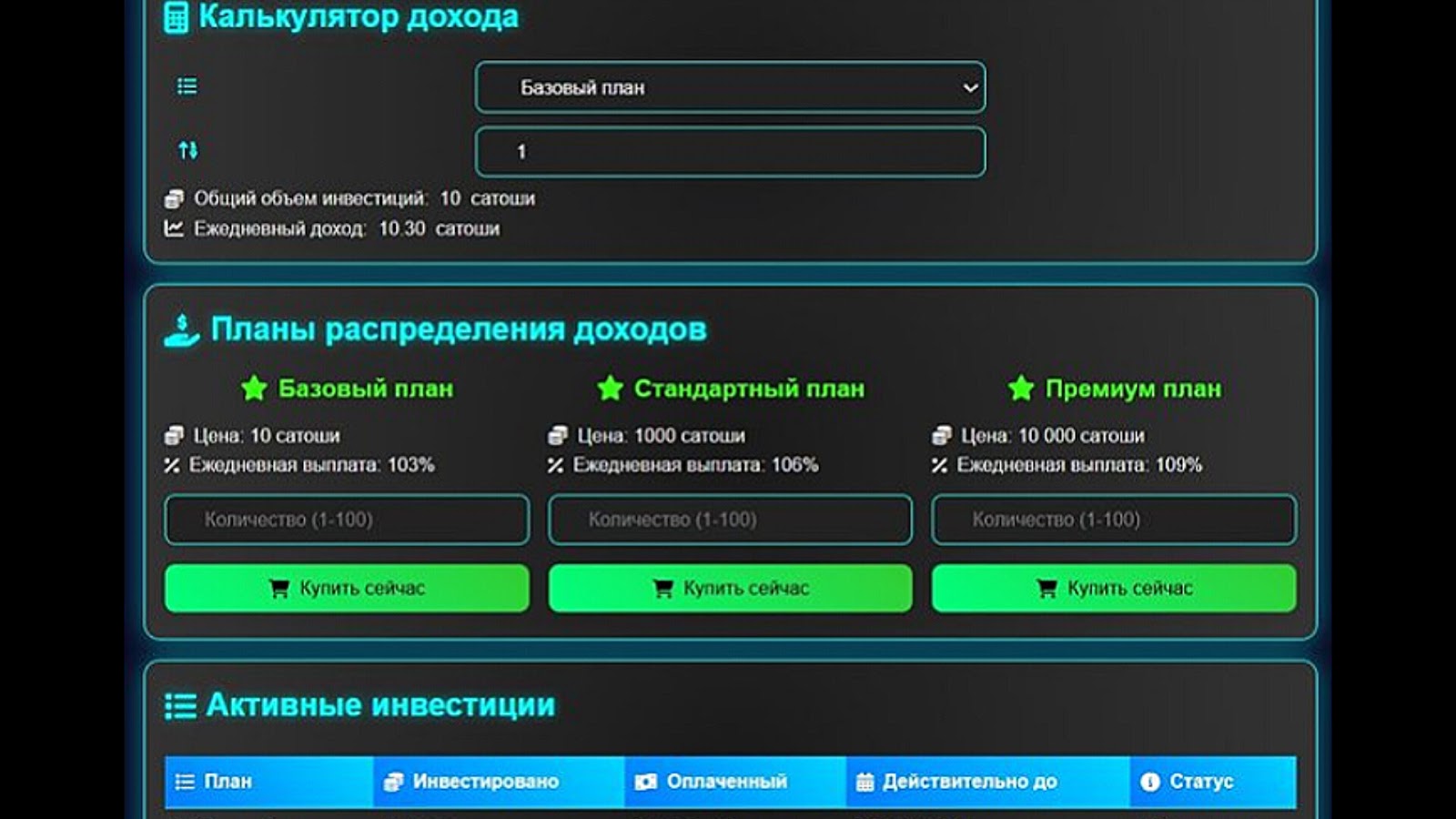 Исходя из доступной информации, пользователи могут получать 0,150 Сатоши каждые 15 сек. Можно проходить опросы, которые оцениваются в 30-420 монет, а также совершать клики за награды от 1 коина. Если клиенты желают получать пассивный доход, то могут выбрать такие тарифы: