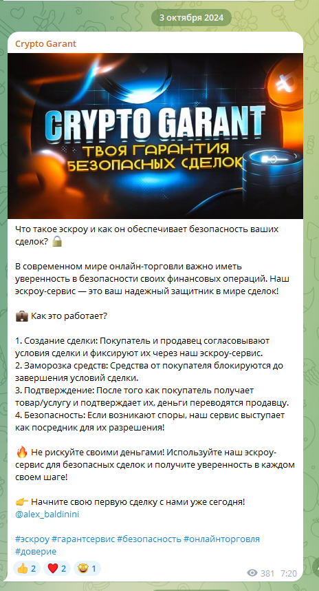 Телеграм-канал Crypto Garant был запущен только 29 сентября 2024 года. Последняя не рекламная запись вышла 14 октября 2024 года. При этом на канале более 49 тысяч подписчиков. Однако по некоторым публикациям видно, что ленту канала практически не смотрят: