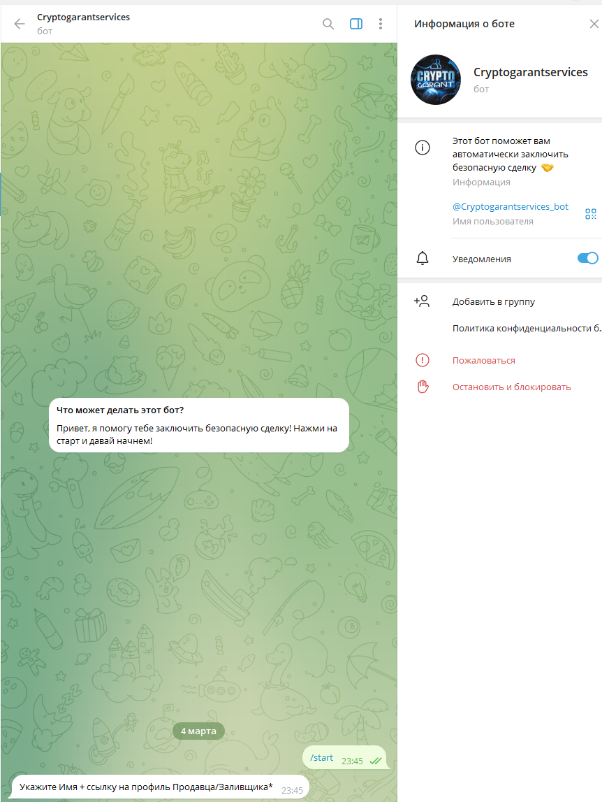 Для совершения сделок доступен бот с простым функционалом. Чтобы совершить безопасную сделку, достаточно просто указать Имя + ссылка на профиль продавца или заливщика. После этого бот связывается со вторым участником сделки и описывается дальнейший механизм работы.