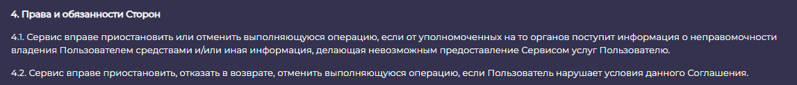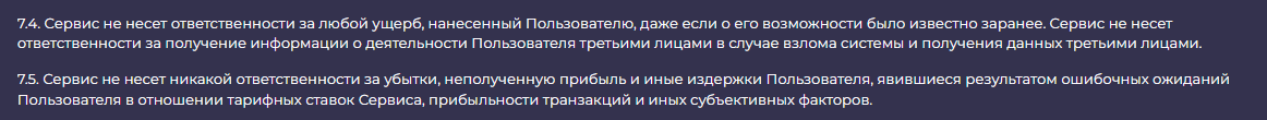 В пользовательском соглашении указано, что сервис не несет ответственности за потери клиентов, может в любой момент приостановить транзакцию, изъять средства, потребовать пройти верификацию. Информации о взимаемых комиссия в нем нет. Документ содержит общие фразы. В нем также нет печатей и подписей, поэтому есть риск нарушения его положений со стороны владельцев Крипто Хаб.