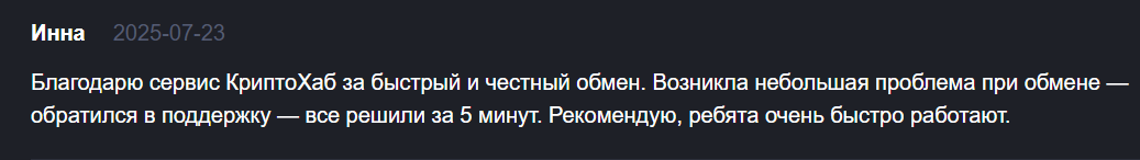 О Криптохаб отзывы неоднозначные. Есть те, которые довольны работой сервиса: они отмечают удобство пользования, оперативность обработки заявок, выгодный курс и качественную техподдержку. Но выглядят эти комментарии неестественно и рекламно, скорее всего, проплачены.