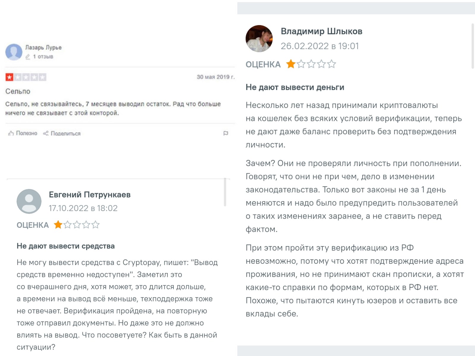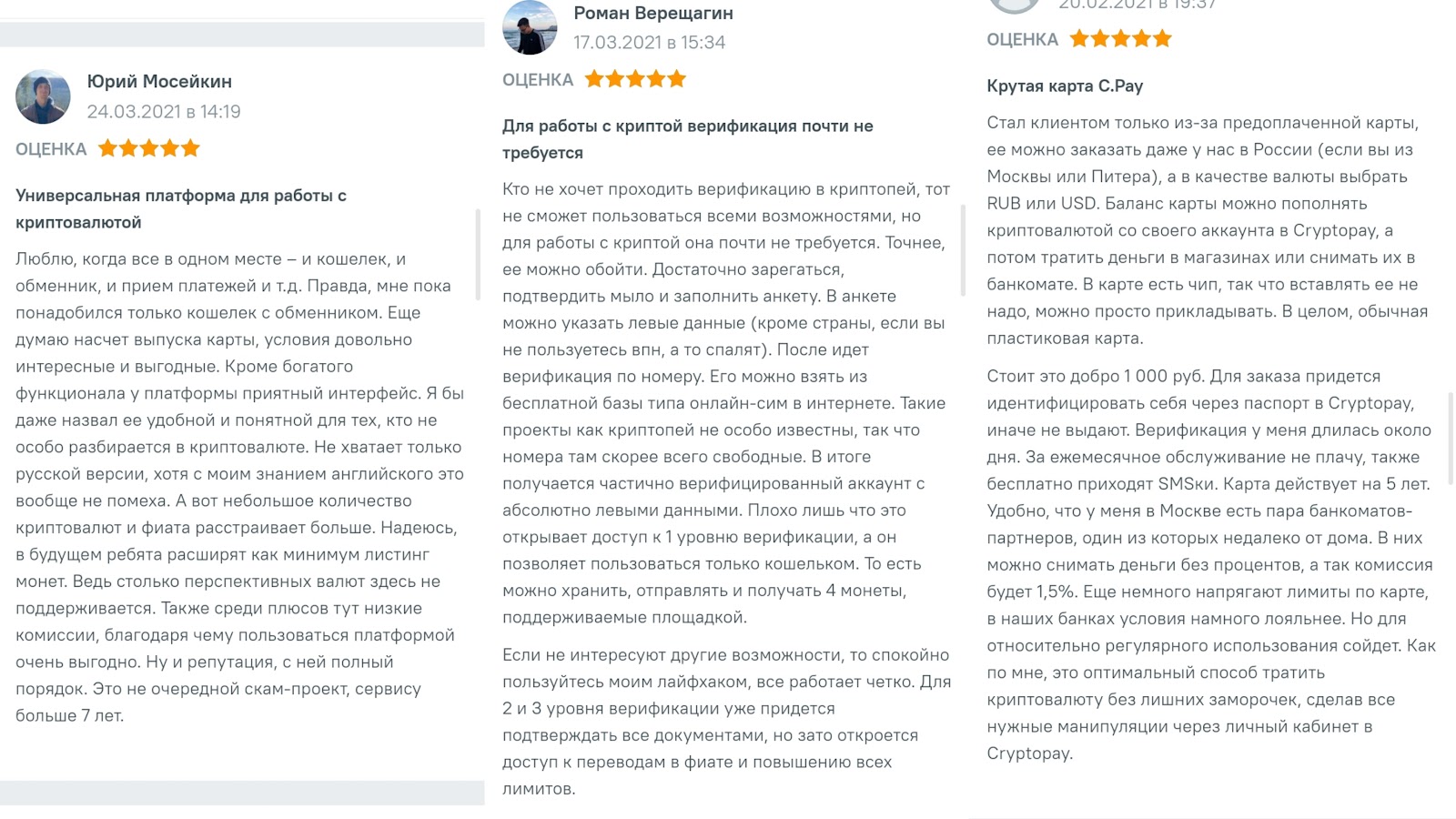 На сторонних платформах есть разные отзывы о Cryptopay. В положительных клиенты отмечают отсутствие обязательной верификации для работы с криптовалютами. Также упоминают удобные функции сервиса.