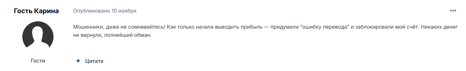 Отзывов о Crypto Invest на независимых источниках практически нет, ведь название биржи схоже с названиями других проектов. На одном из форумов удалось найти единственный отклик от некой Карины, которая утверждает, что проект мошеннический. При попытке вывести средства с платформы, менеджеры сказали, что возникла ошибка перевода, после чего заблокировали счет Карины.