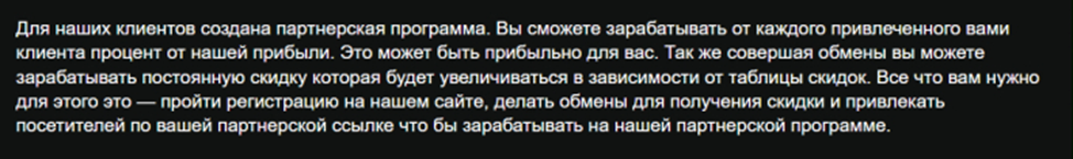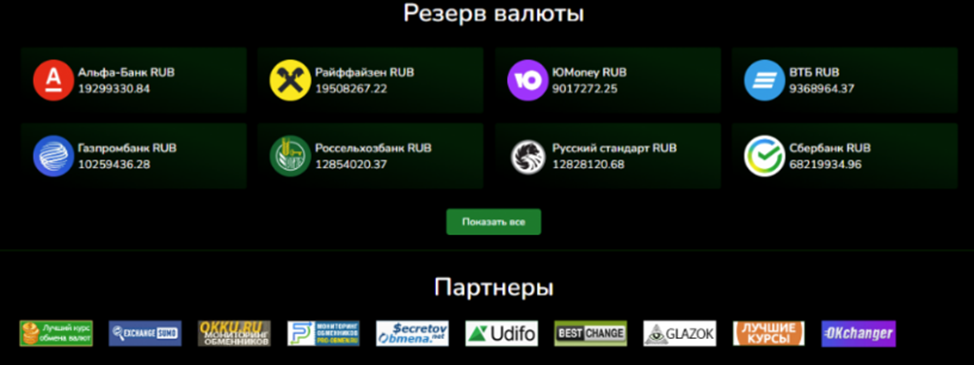 Компания указывает гигантские резервы валюты, которые по сумме сопоставимы с капиталом крупного банка. Также на сайте есть список партнеров, среди которых есть и довольно авторитетные агрегаторы криптообменников.