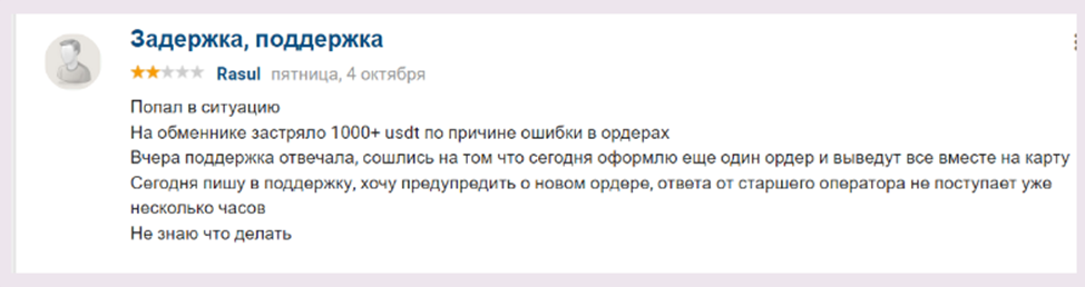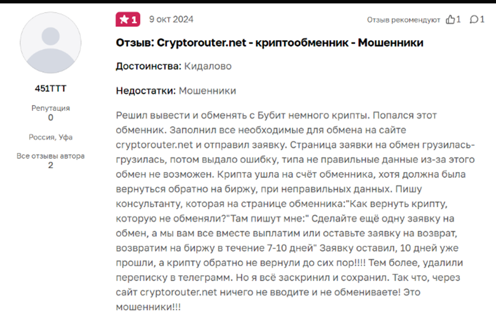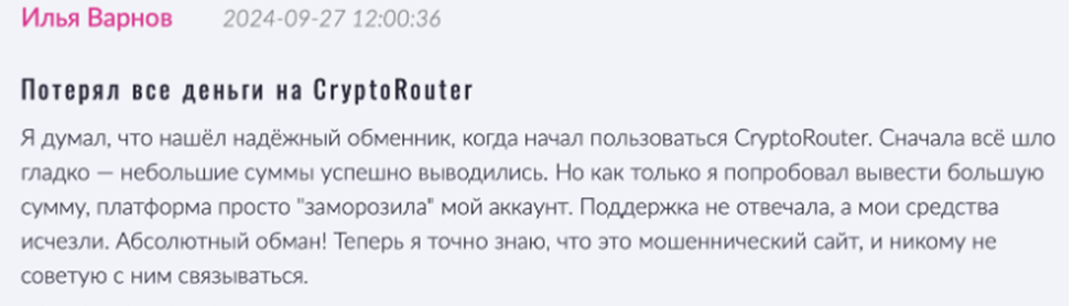 В отзывах о Cryptorouter клиенты жалуются на постоянные проблемы с сервисом. Перед оформлением они по несколько раз проверяли исходящие данные заявки, но все равно служба техподдержки утверждает, что деньги были отправлены не туда. По этой причине обмен аннулируется без какой-либо компенсации.