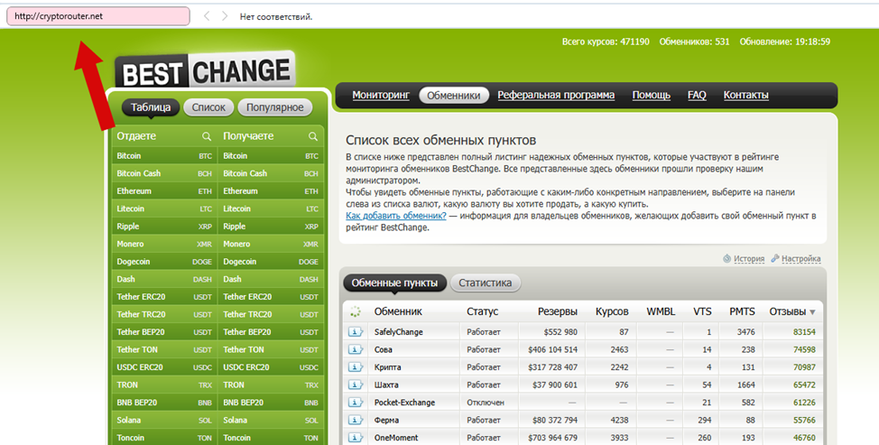 Мы проверили информацию о Cryptorouter net на Bestchange. В списке из 531 онлайн-пунктов такого не значится.