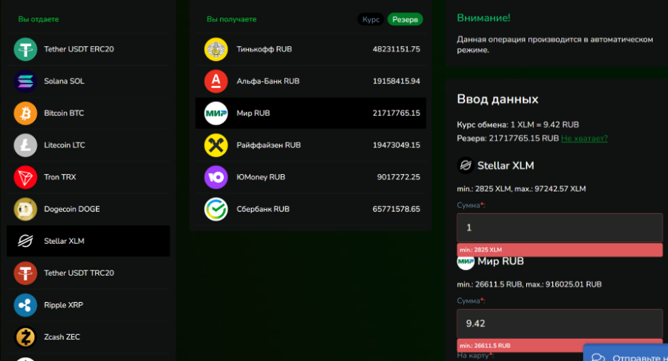 Операции по обмену в Cryptorouter проводятся в автоматическом режиме. Для начала клиент должен выбрать на главной странице интересующее направление.