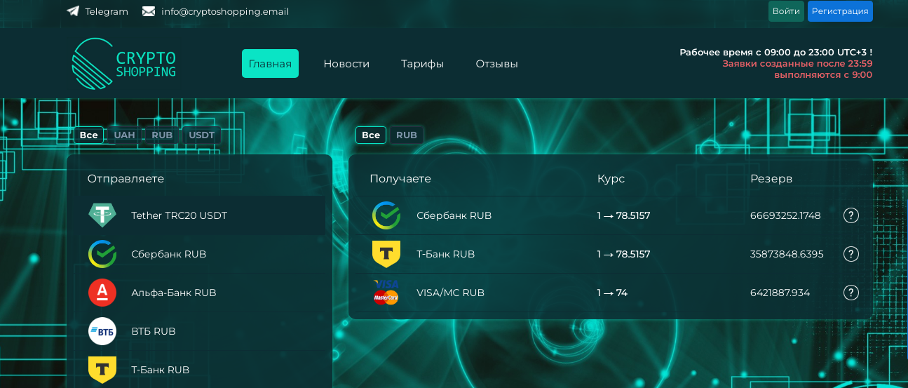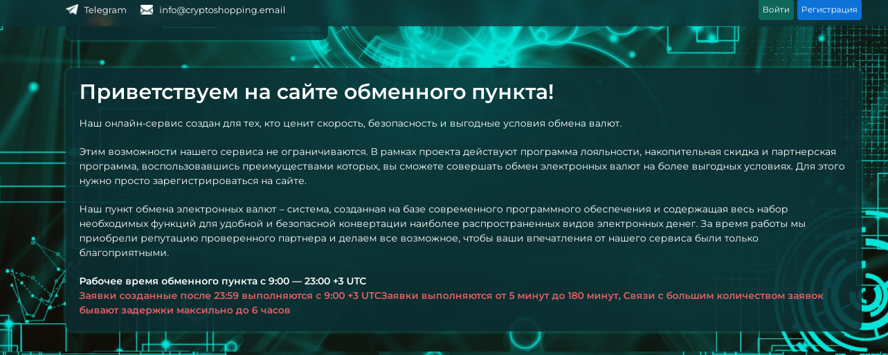 Cryptoshopping – это классический онлайн-обменник, в котором пользователь выбирает направление обмена, указывает реквизиты и проводит транзакцию через интерфейс сайта. Основной упор сделан на работу с фиатными валютами российских банков и популярными криптовалютами. На сайте cryptoshopping info сказано, что сервис функционирует с 2020 года, хотя конкретные юридические документы, подтверждающие дату основания и регистрацию компании, отсутствуют.