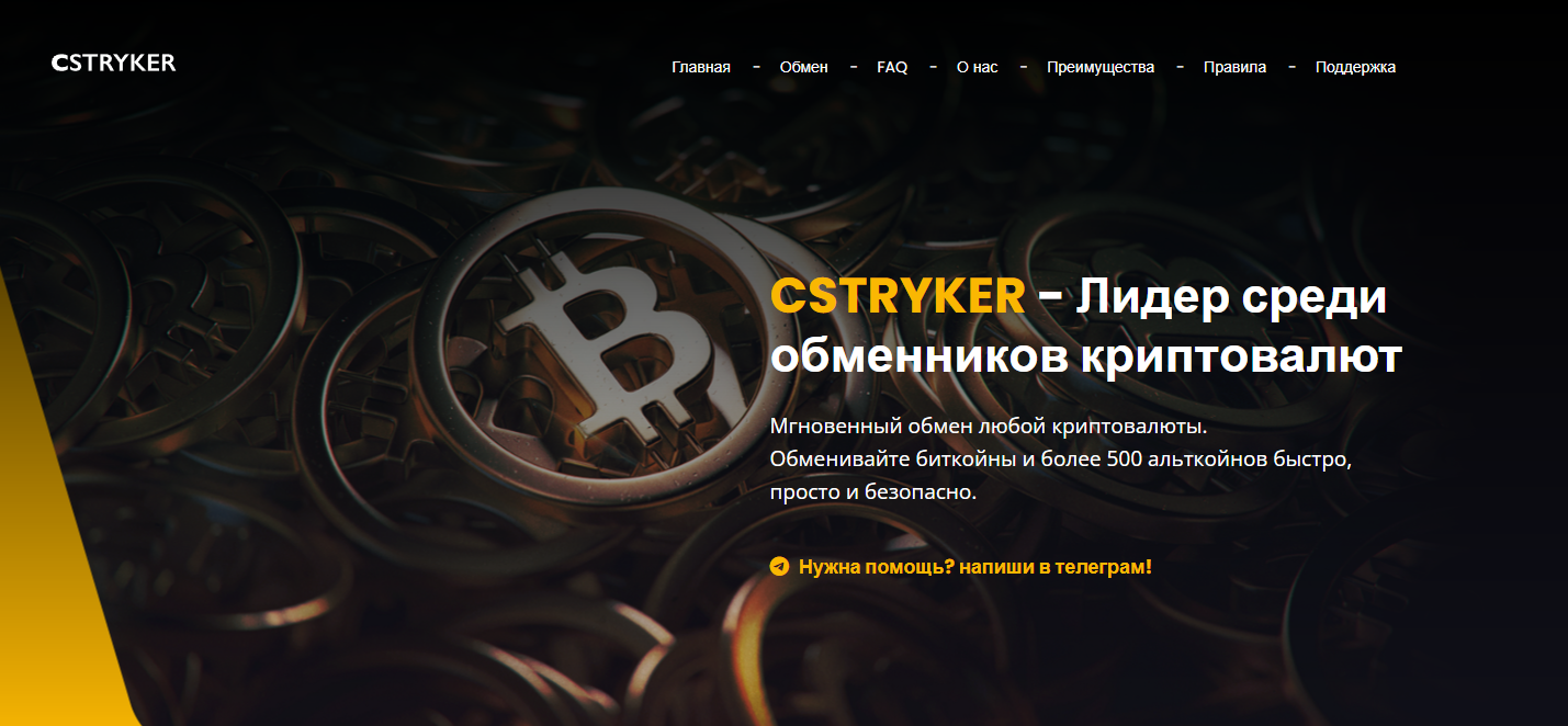 cstryker com обменник, администраторы которого обещают хороший обменный курс, безопасный и мгновенный обмен более 500 монет. Создатели сервиса говорят о многолетнем опыте работы с криптовалютой. Однако в ходе обзора мы нашли большое количество противоречивых моментов, которые стоит озвучить.