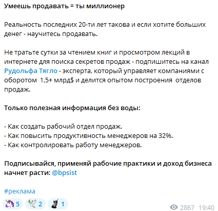 Активность на канале средняя. Посты набирают по 1.5 — 3.5 тысячи просмотров. Самые интересные, которые залетали в рекламе — до 20 000. Реакций до 50. Аудитория не сильно вовлеченная. В комментариях почти нет активности.В целом, стандартный Telegram-канал, который рассказывает о бизнесе. Аудитория не сильно вовлечена. Люди просто заходят, смотрят на контент, почти ничего не отвечают.