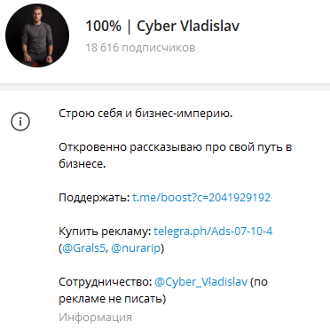 Канал 100% | Cyber Vladislav отзывы еще не собрал. Молодой человек рассказывает о бизнесе, IT, заработке на Telegram. Проект очень похож на очередной блог для раскрутки в инфобизнесе. Нужно понять, стоит ли подписываться на канал и принесет ли он пользу читателям.