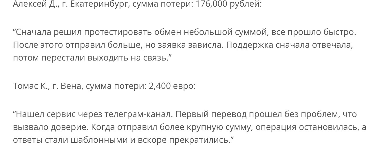 В них пишут, что сервис отлично работает на начальных этапах и на маленьких суммах, которые обычно клиенты заводят «на пробу». Но когда на обмен поступают более серьезные транзакции, обратно средства администрация не отправляет, а саппорт перестает общаться с пользователем.