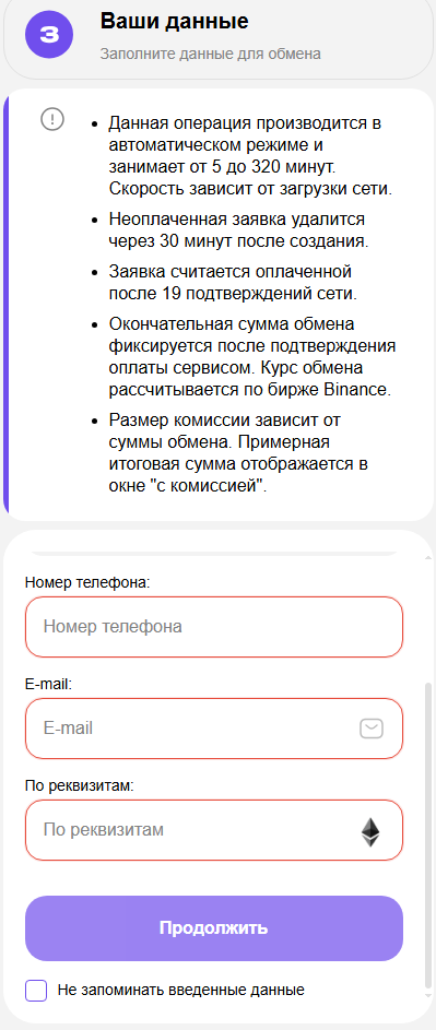 Сервис не требует регистрации и не дает такой возможности. Для обмена нужно лишь выбрать направление, указать адрес кошелька и электронную почту для отправки информационных писем. Пользователям обещают обработку транзакции в течение 5–320 минут.