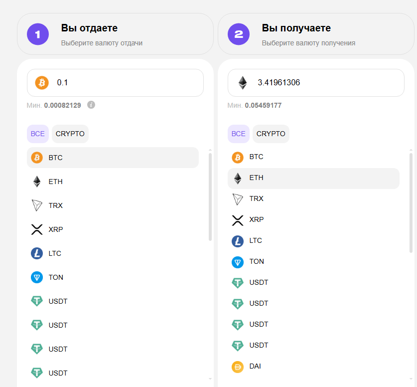 Обменник работает как с популярными монетами, так и с некоторыми мем-токенами. Фиатные деньги не поддерживаются. В правилах указана комиссия в размере 1% от суммы перевода.