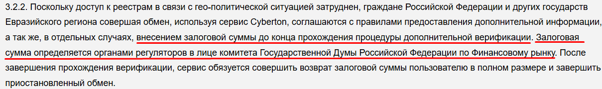 Первое, что бросается в глаза при проверке Cyberton — это домен без реальной истории. Формально он зарегистрирован еще в 2018 году, однако данные WebArchive показывают практически полное отсутствие активности за прошлые годы. Такое часто бывает у «спящих» проектов, которые долго не использовались, а затем их выкупили и перезапустили мошенники.Еще один тревожный момент — обменник отсутствует на BestChange, сайте, где публикуют список проверенных площадок с отзывами. Но самый серьезный сигнал мы нашли в правилах работы. В пункте 3.2.2 прямо написано, что пользователи якобы обязаны вносить обеспечительный залог для прохождения дополнительной верификации по требованию комитета Госдумы РФ по финансовому рынку. Это неправда: данный комитет не является регулятором, не устанавливает залоги и не имеет отношения к частным обменникам. Более того, процедуры KYC и AML у легальных сервисов всегда проходят бесплатно.