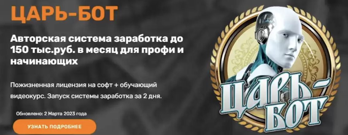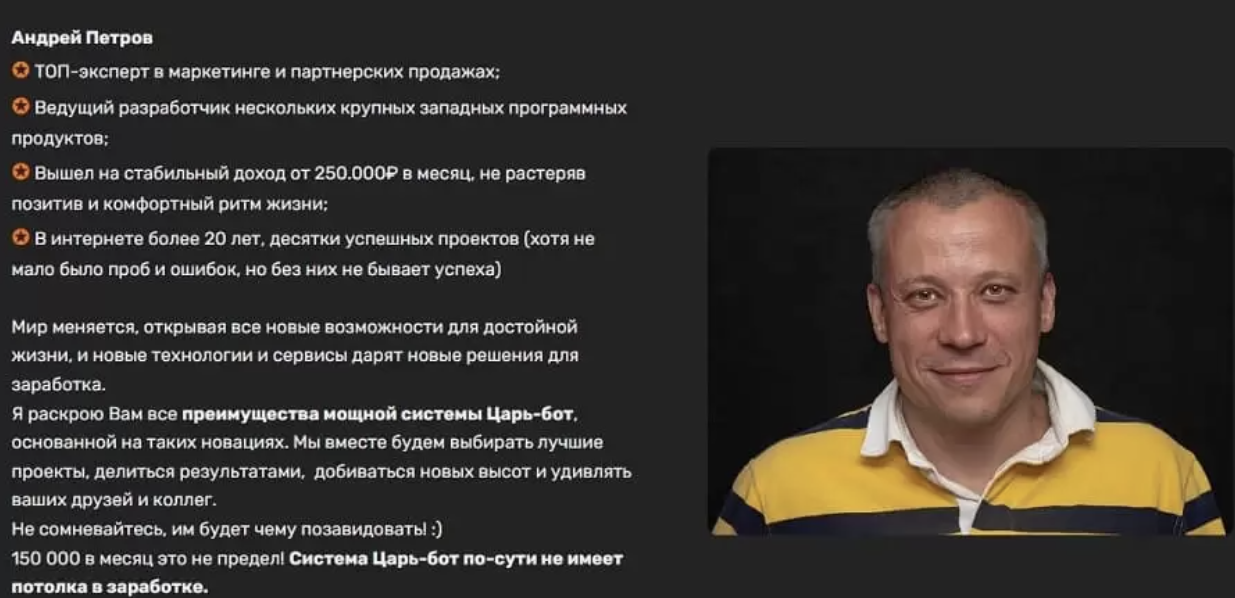 «Царь Бот» — программное обеспечение, при помощи которого якобы можно было зарабатывать до 150 рублей в месяц на автомате. Его разработчиком является некий маркетолог Андрей Петров.