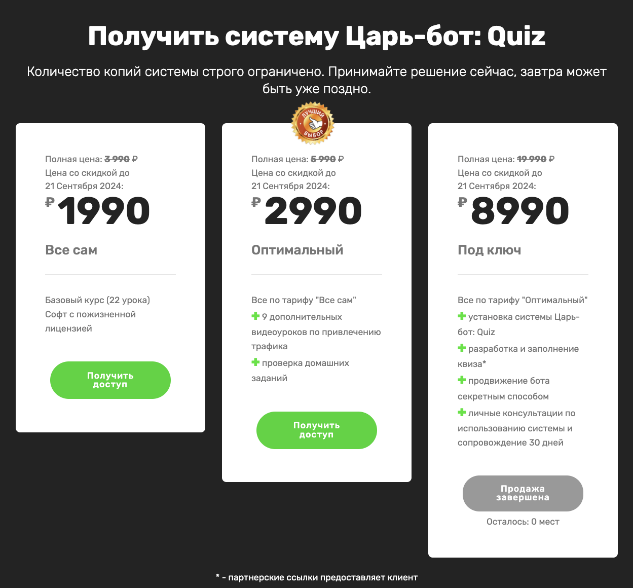 Клиент мог получить доступ к этой методике в соответствии с одним из тарифов, чья стоимость варьировалась от 1990 до 8990 рублей. После оплаты покупателю обещали предоставить не только доступ к боту, но и дать обучающие материалы по его использованию.