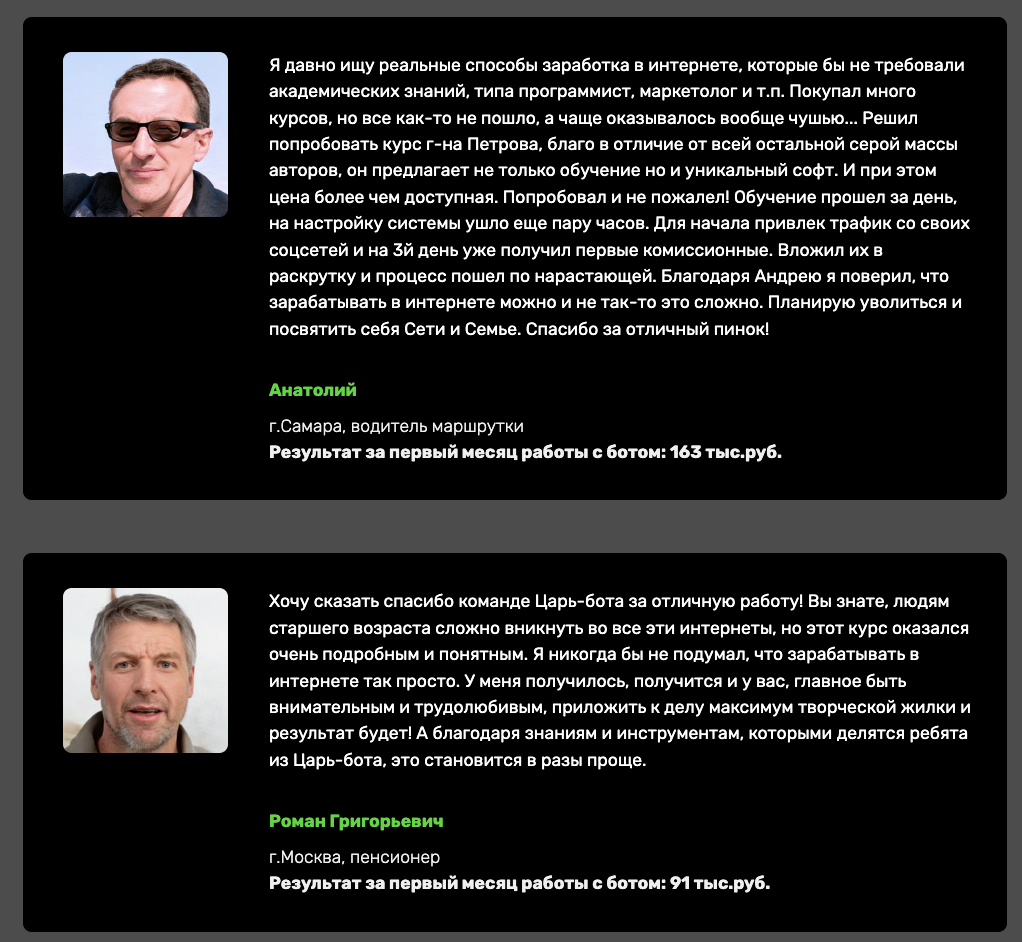 На сайте tsar bot ru присутствовал блок, в котором были опубликованы отзывы об использовании бота Петрова. Правда, никакого доверия эти ревью не могли бы вызвать. Данные отзывы даже не дополнены ссылками на аккаунты в соцсетях людей, которые их оставили. Поэтому велика вероятность, что эти сообщения разместил сам основатель проекта или кто-то по его заказу.